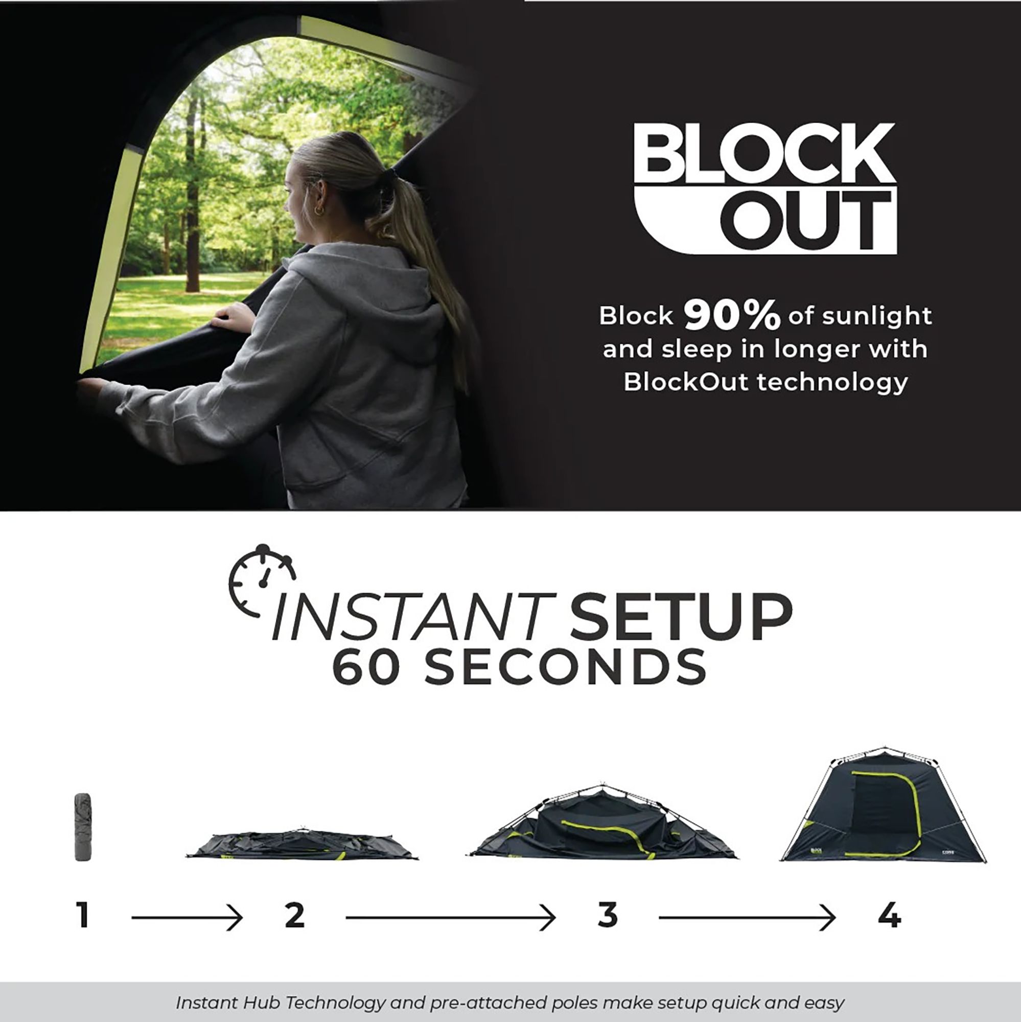 - INSTANT SETUP: The tent body with pre-attached poles that lock into place creates a setup time as short as 60 seconds