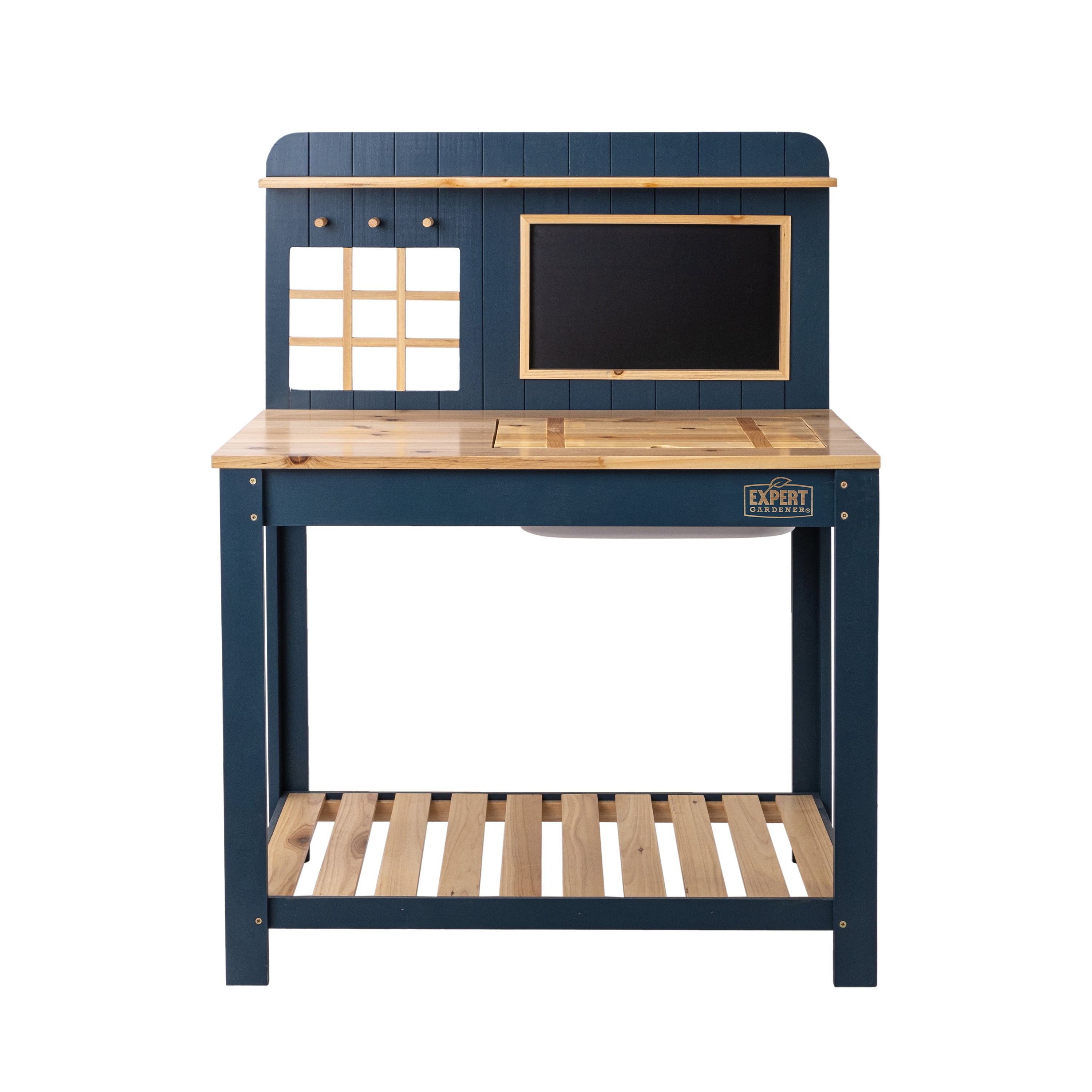 Expert Gardener Blue Wood Kids Potting Bench with Removable Sink is ideal for any garden task. The spacious work surface on top of the potting bench with the sink gives kids enough space to tackle so many of those gardening jobs. Assembly instructions come with the product for convenience. The hooks it nice to keep kids’ favorite trowel, trencher, or other tools in arm’s reach.. This potting bench is durable to ensure that it withstands the outdoor elements. A small blackboard come with 4 colorful chalk for kids to record the daily. The natural wood grain on the boards adds a rustic and natural style to your garden.