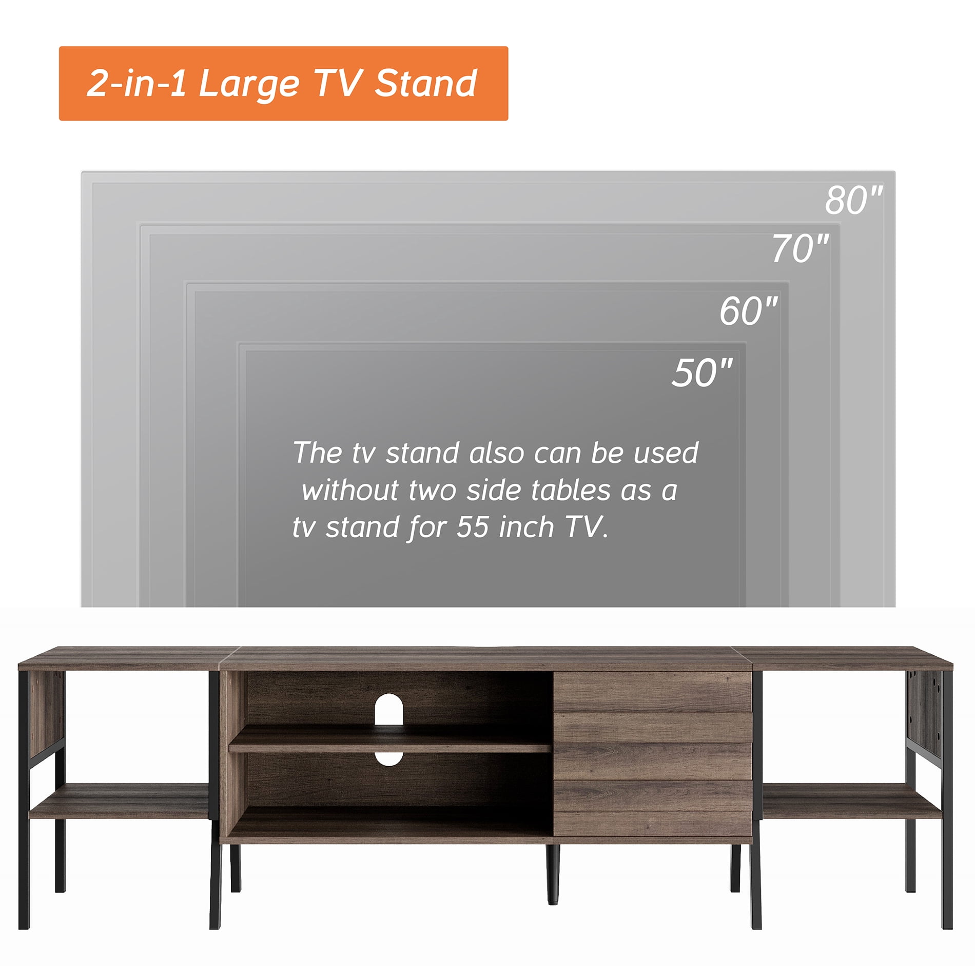 【3-in-1 Large Size TV Stand】Comes with two 15.7 inch end tables can be simply fixed to the TV console by screws.So you could splice them to get a 60 or 75 inch TV stand which can accommodate 55-85 inch TV