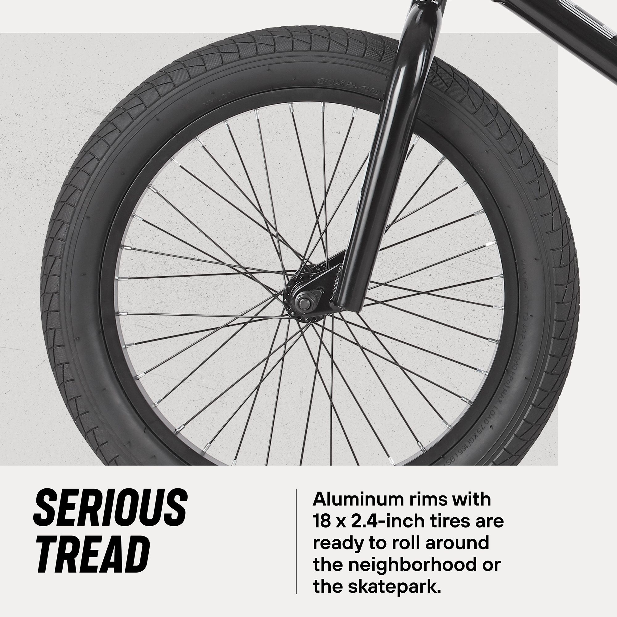 - Aluminum rims with 18 x 2.3-inch tires are ready to roll around the neighborhood or the skatepark