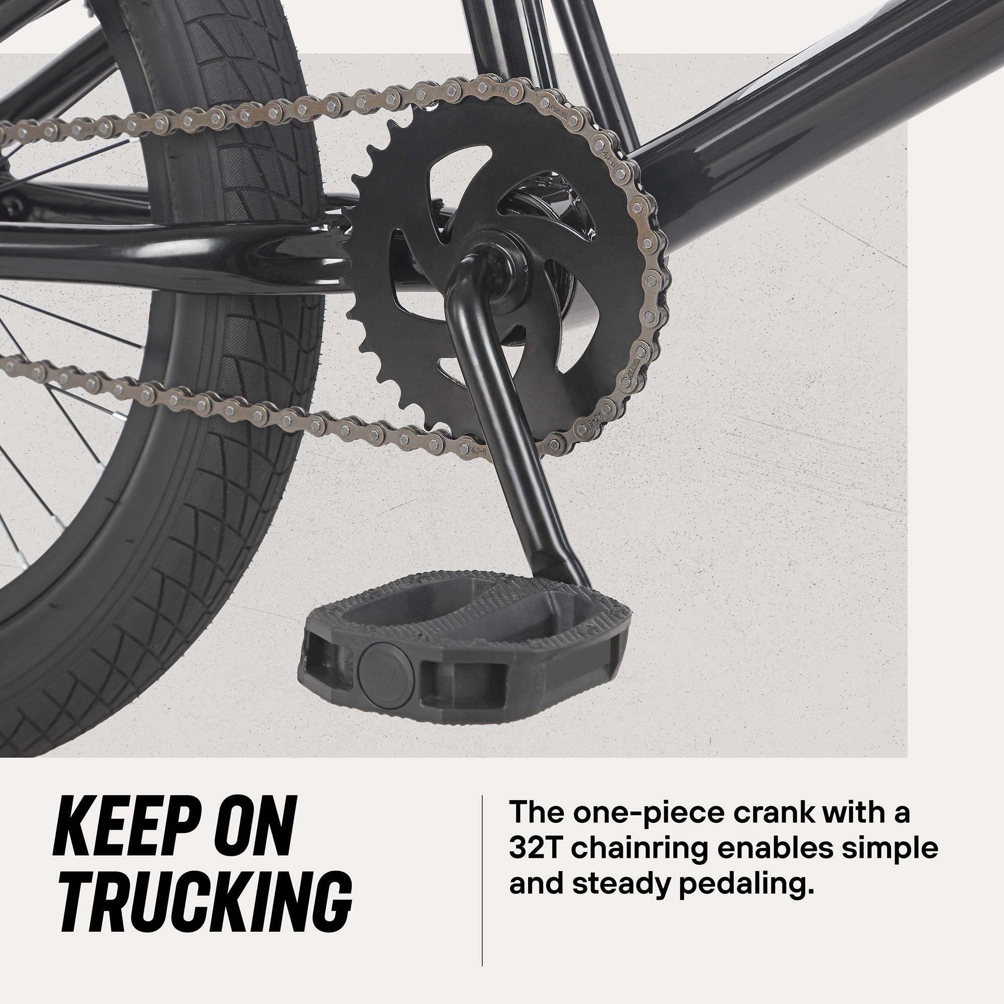 - One-piece crank with a 32T chainring and 16T freewheel enable simple and steady pedaling
