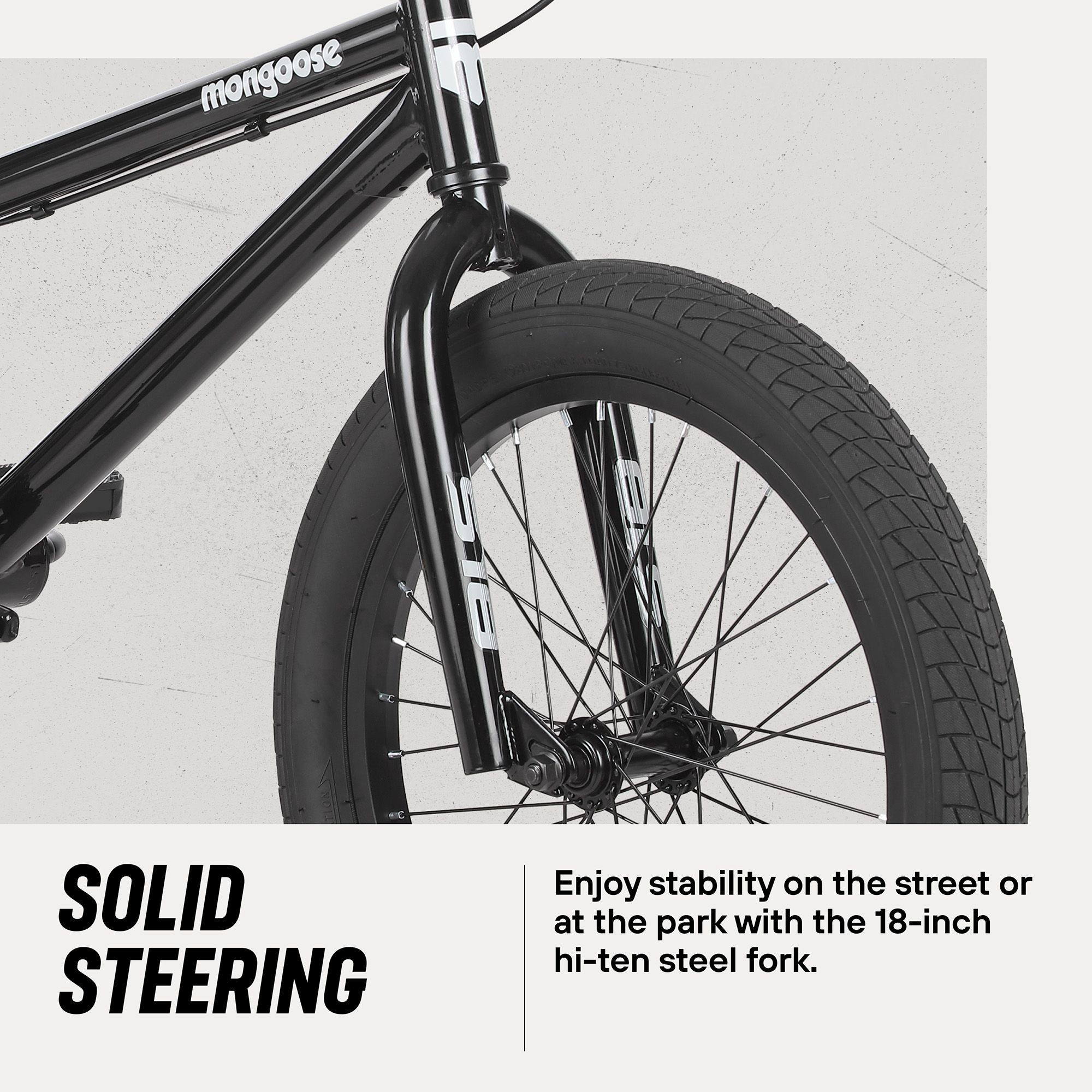 - Mongoose 20-inch Hi-Ten steel fork provides stability on the street or at the park