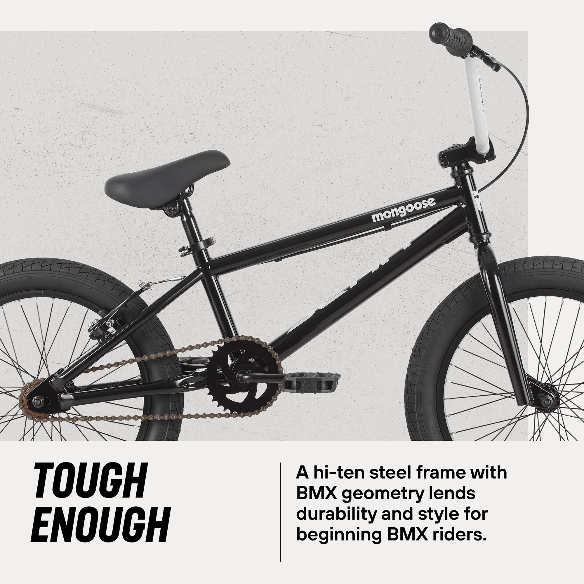 - Hi-Ten steel frame with BMX geometry lends durability and style for beginning BMX riders