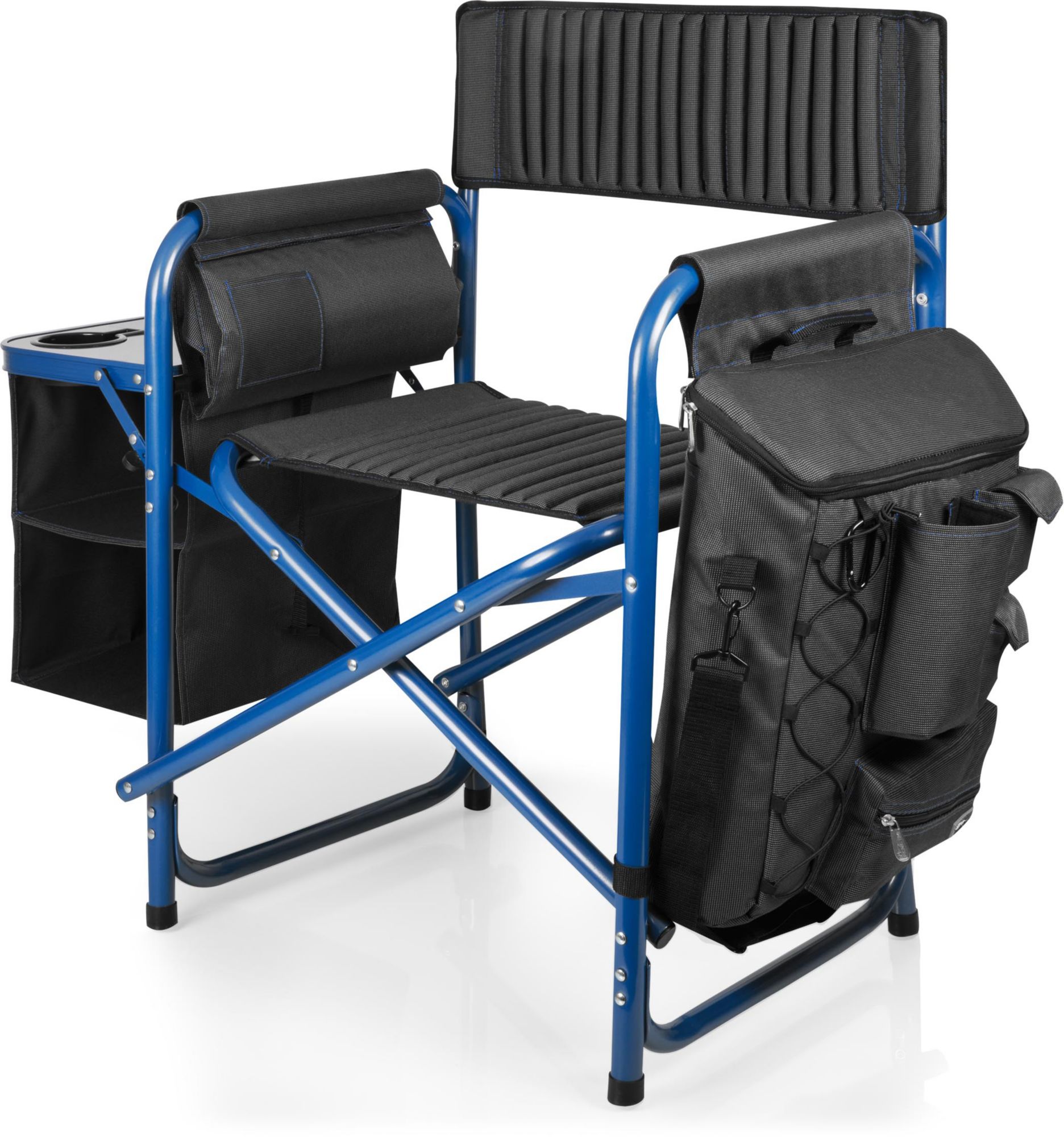 - Fully-detachable, side-mounted 24+1-can insulated cooler with a multitude of storage pockets and adjustable shoulder strap so cooler can be used independent of the chair