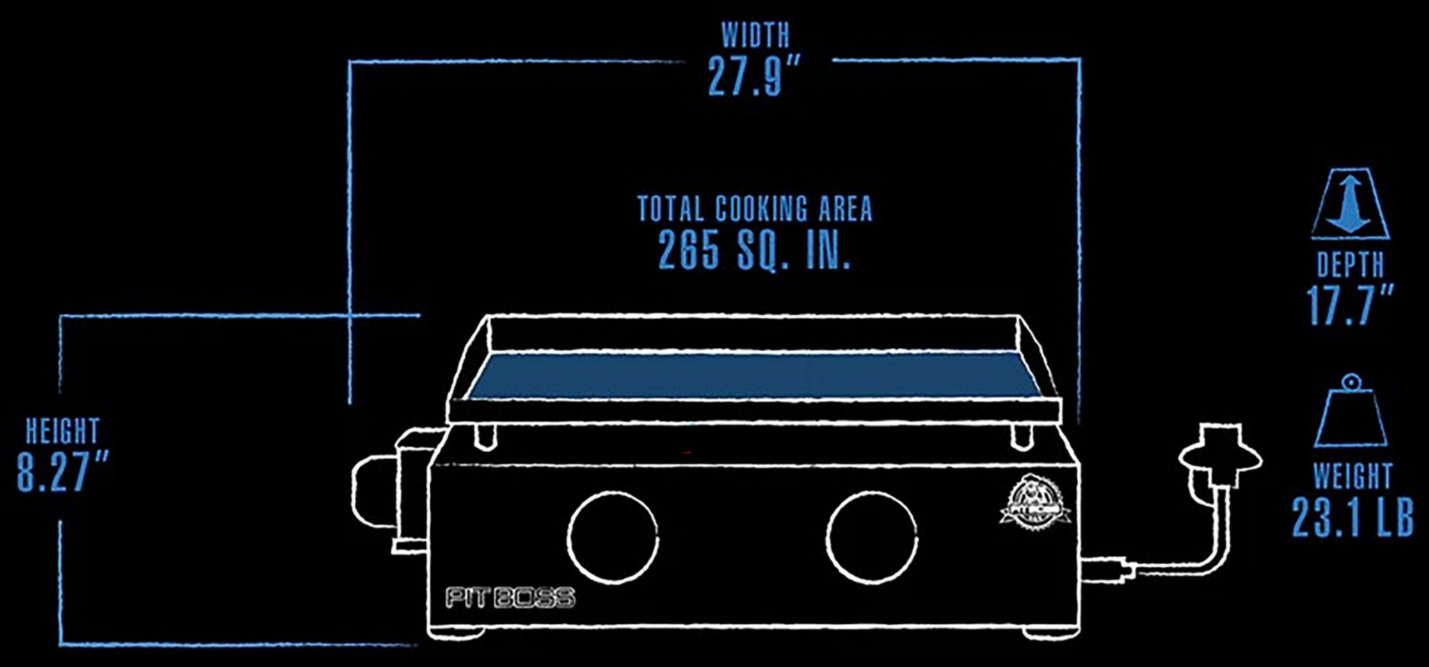- 265 square inches of cooking space; griddle top measures 18.5″L x 14.33″W
