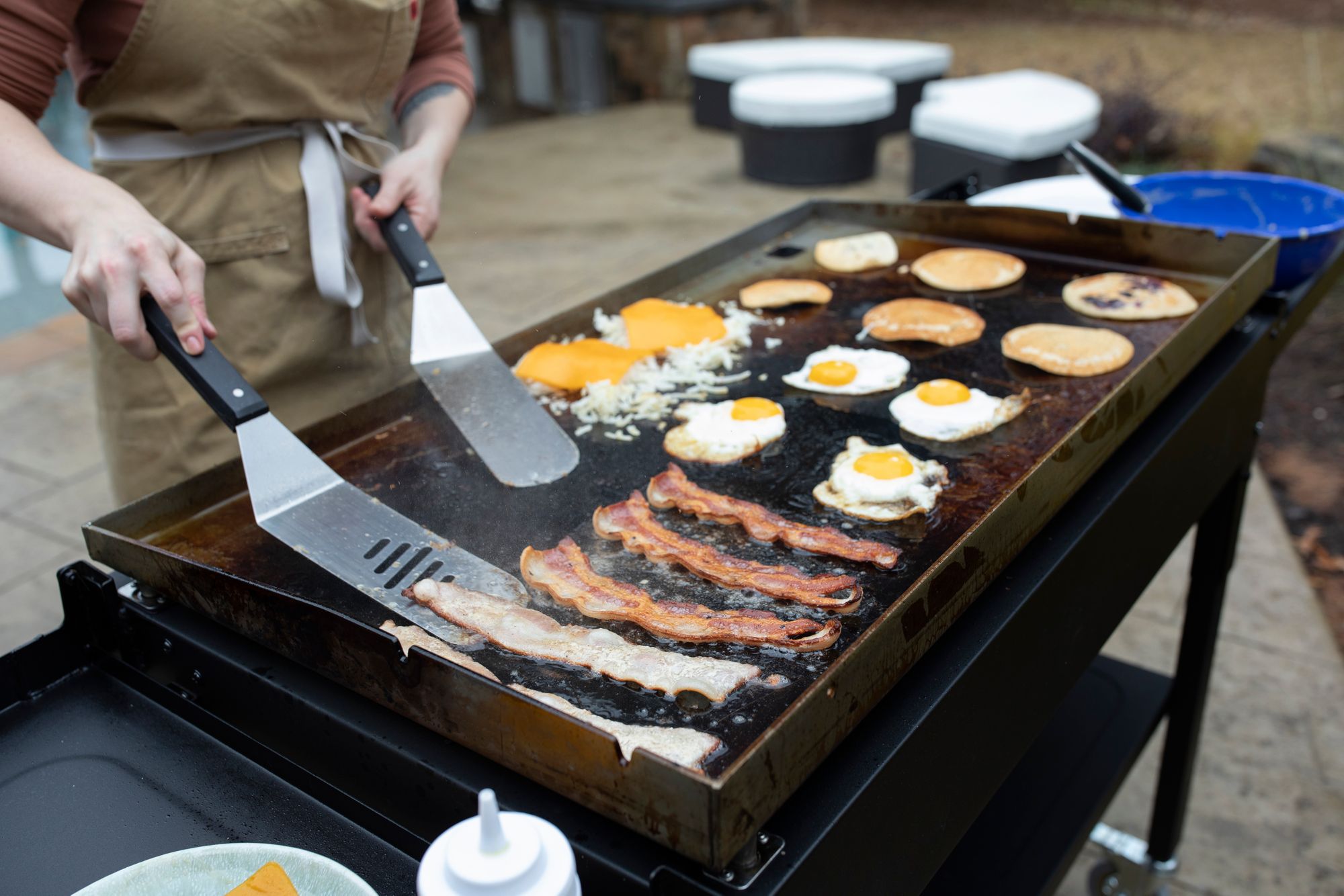 - Durable rolled steel with pre-seasoned griddle top