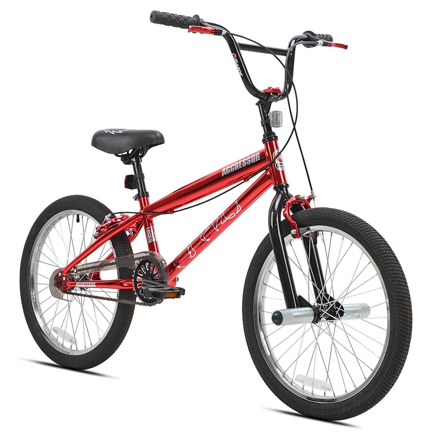 The 20″ Razor Aggressor Boy’s BMX Bike is perfect for taking on new tricks, moves and terrain. Packed with cool features, the Razor Aggressor features a sturdy, reinforced steel freestyle frame and fork. Alloy brakes offer safety and security while the 20″ tires are designed for high traction and speeds. The Aggressor freestyle bike features pegs – just like the big bikes – for a strong starter tool. Heavy duty Front pegs 4-bolt stem