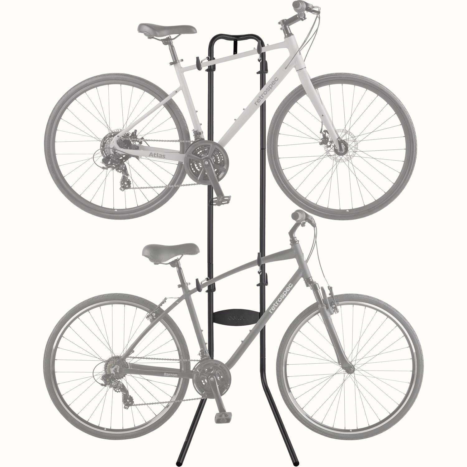 Defy gravity with this simple, stress-free, multiple bike storage solution that saves space wherever you keep your bikes. Double Decker stands up against the wall (no hammering, drilling, or mounting required) and offers vertical bike storage for up to 2 bikes – resulting in maximum efficiency with minimal effort. This bike stand can hold up to 80 lbs (40 lbs per bike) with adjustable arms to accommodate most frame styles, and its soft, rubber bumpers keep your bikes, floors, and walls safe and scratch-free. 2 Bike capacity safely suspends & stores 1-2 bikes
