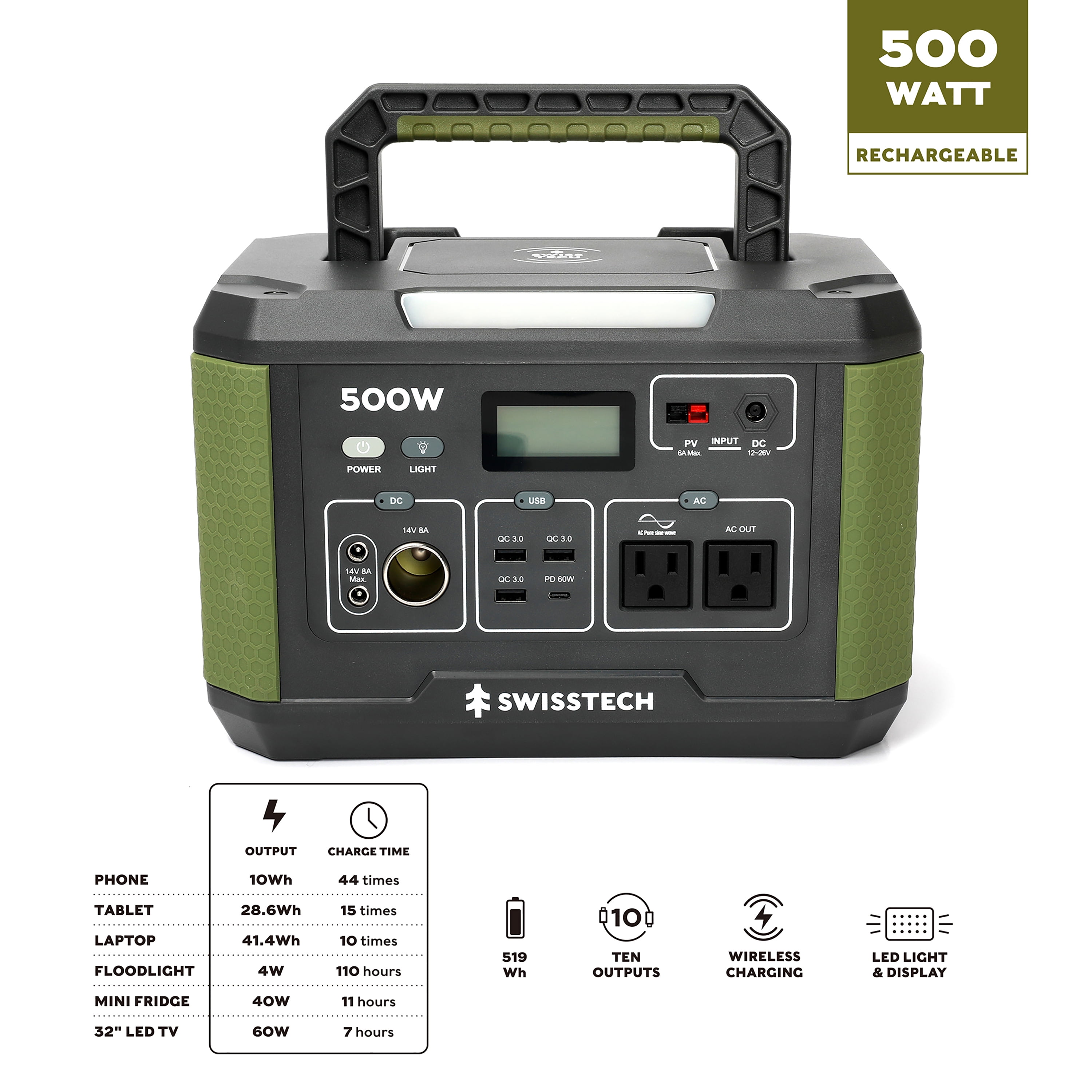 The Swiss Tech 500W Portable Wireless Power Station is built for long-lasting adventures. Whether you are camping, over-landing, tailgating, or boating, this heavy-duty and compact power station provides reliable power that lets you take your adventure anywhere. This power station features a wireless pad for convenient phone charging. Output capabilities include (1) Wireless, (2) DC 14V/8A, (1) 14V/8A DC Auxiliary, (3) USBA, (1) USBC, and (2) AC 2 and 3 Prong. Keep the power station charged with the provided DC, Car Port, or Solar cords.