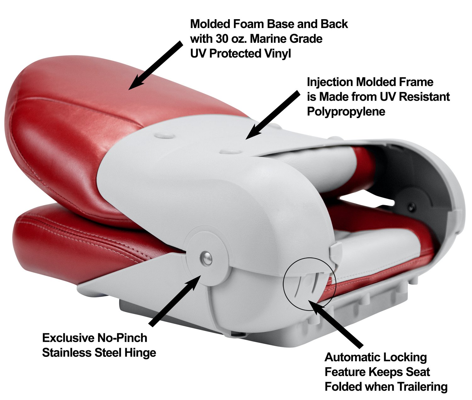 - No-pinch hinge with an automatic locking mechanism secures the seat in the folded position