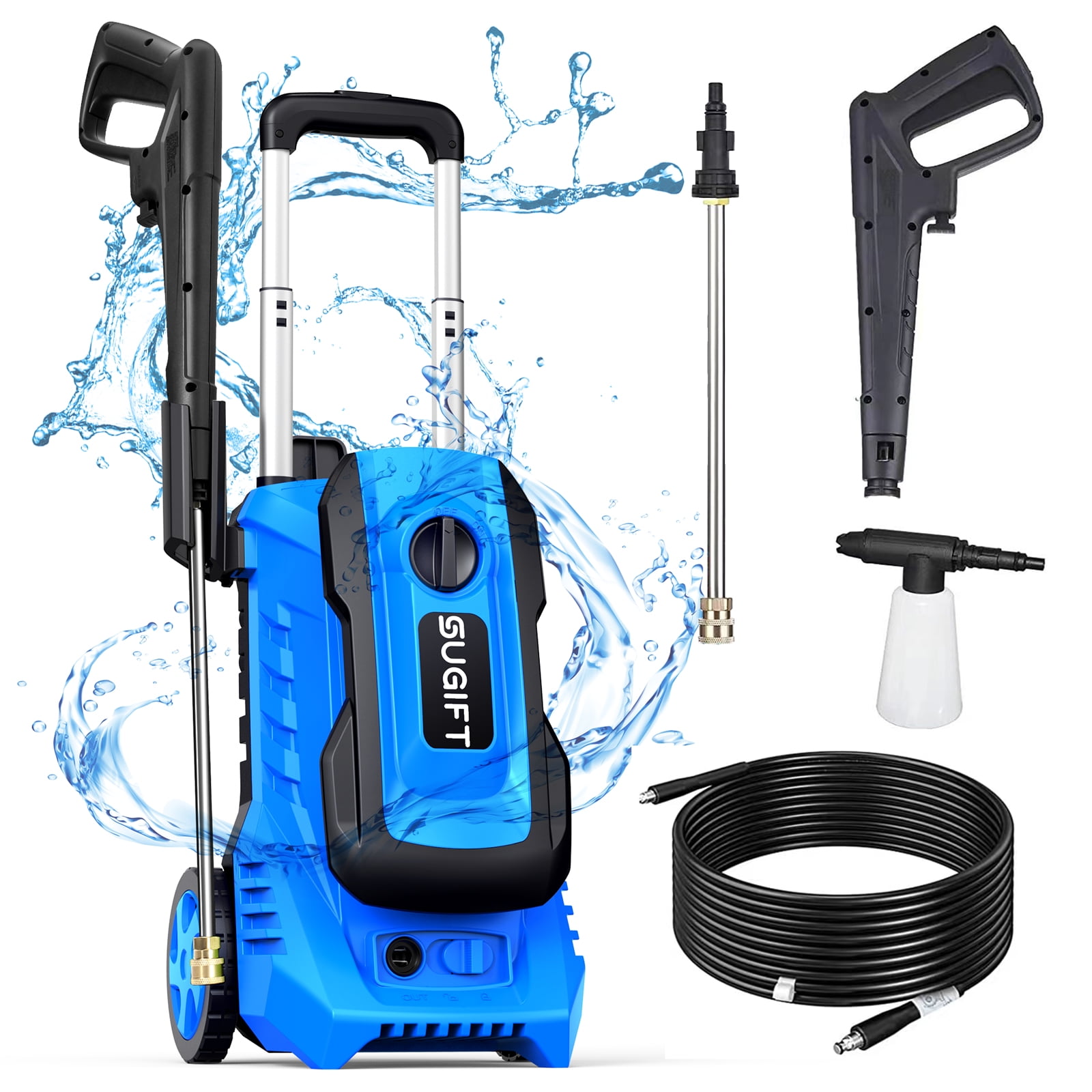 5 QUICH CONNECT SPRAY HEADS: The electric washing machine comes with 5 interchangeable spray nozzles (0°, 15°, 25°, 40° and soap) to meet your different cleaning needs. 0º – high and hard to reach areas; clean gaps in sidewalks or driveways; 15º- for concrete, brick and other hard surfaces with stubborn stains; 25º- for car surfaces, wood siding, fences and lawn mowers ;40º- for windows and screens; Soap- for spraying soaps and cleaners.