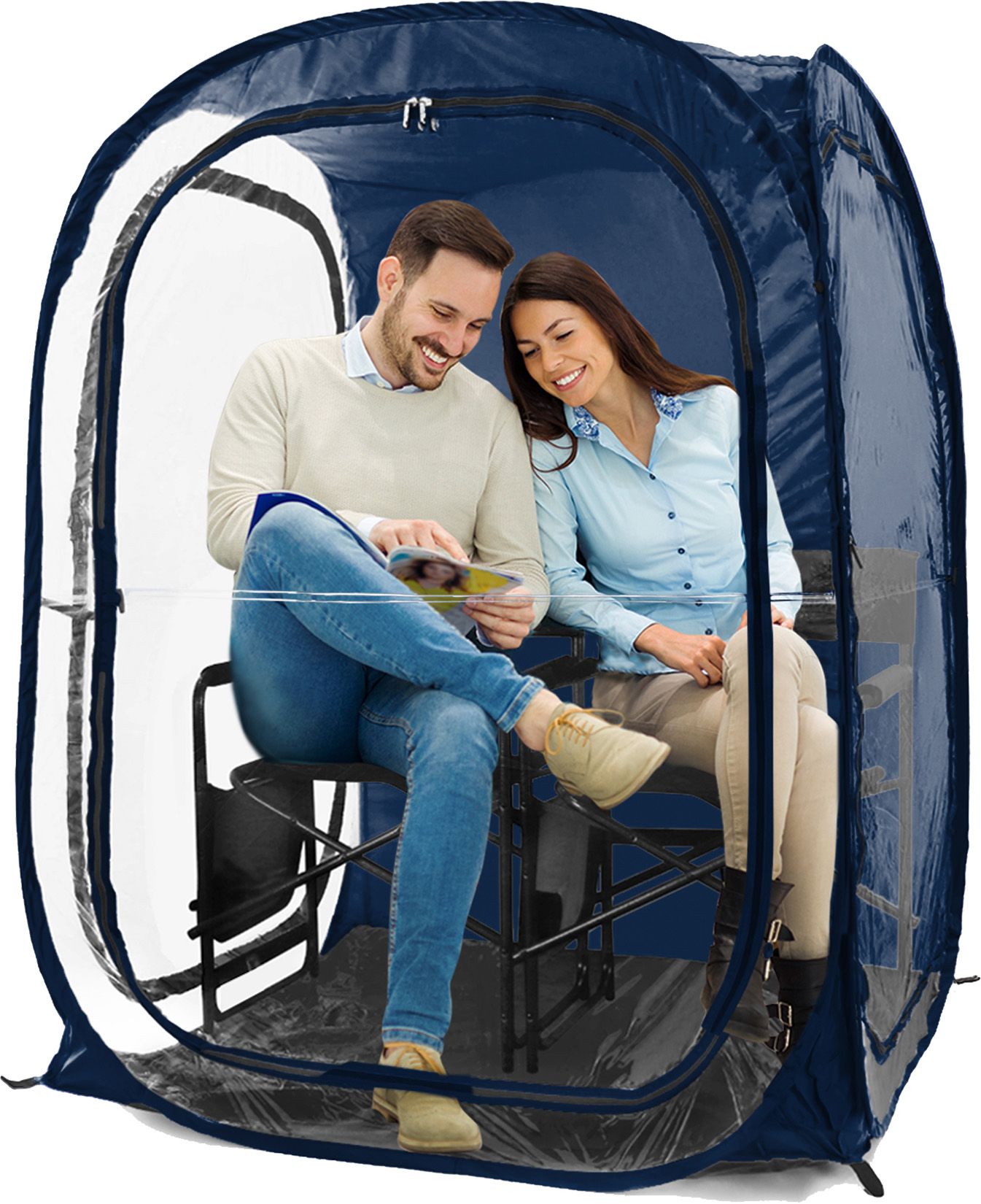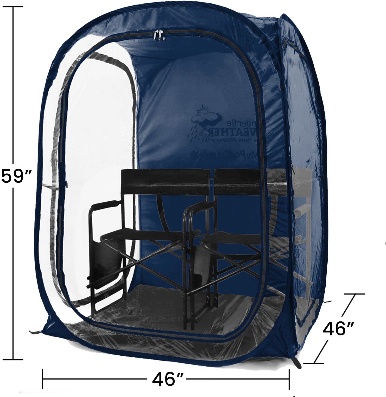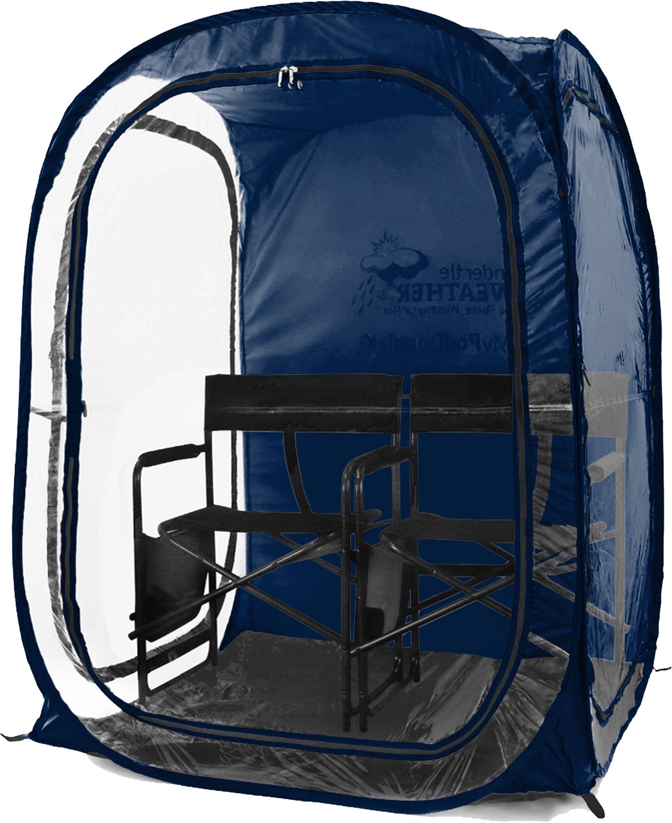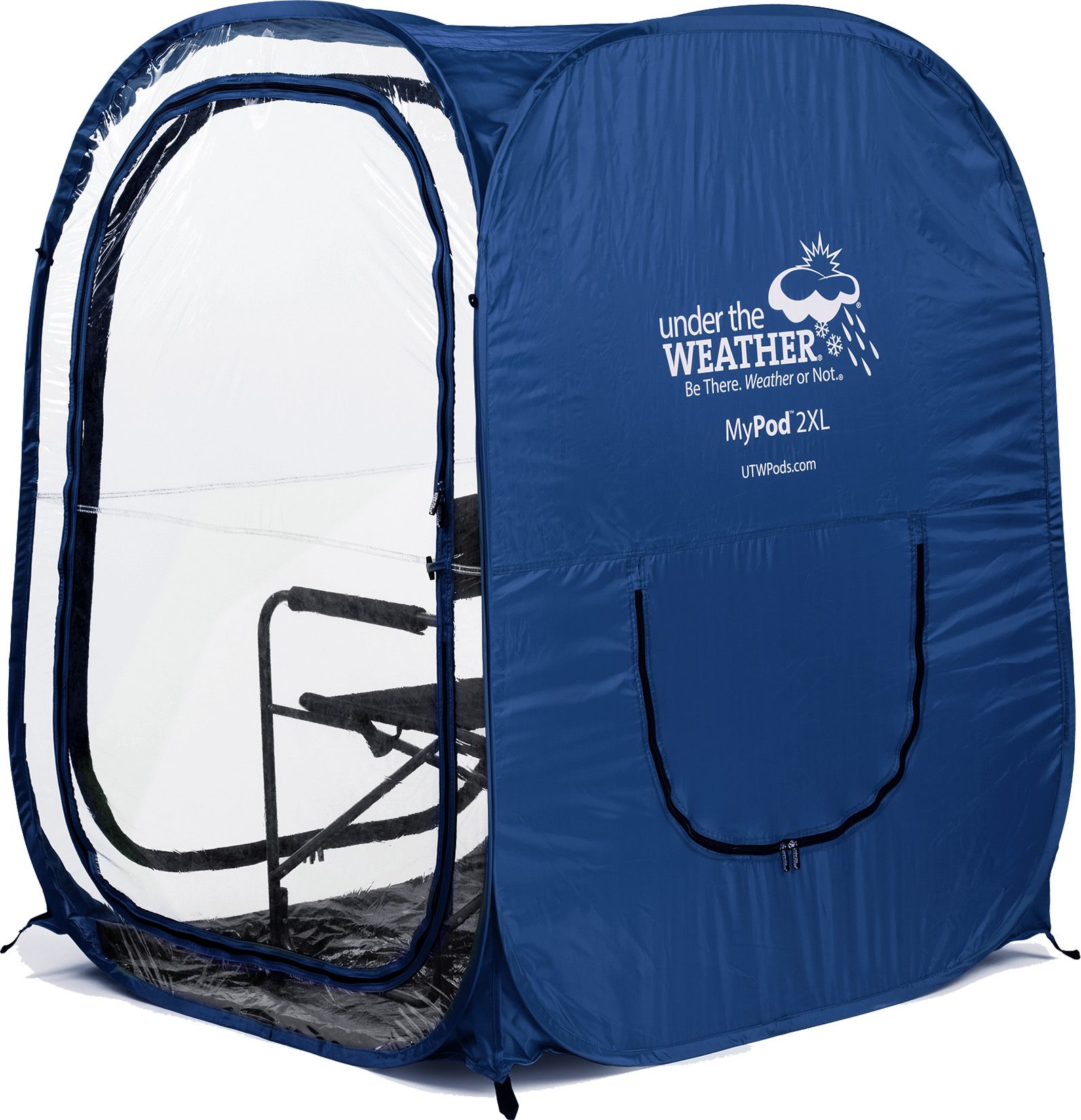 The MyPod™ XL is a one- to two-person pop-up WeatherPod™ that’s a must for sport parents and outdoor enthusiasts. The XL is weatherproof with cold-treated clear plastic double-zip panels that keep the cold, wind and rain out. Remove it from its backpack case, pop it open, add some chairs, and you’re all set—it’s that easy. There is room for one sports chair or two small director chairs. When you’re done fold it down just as quickly.