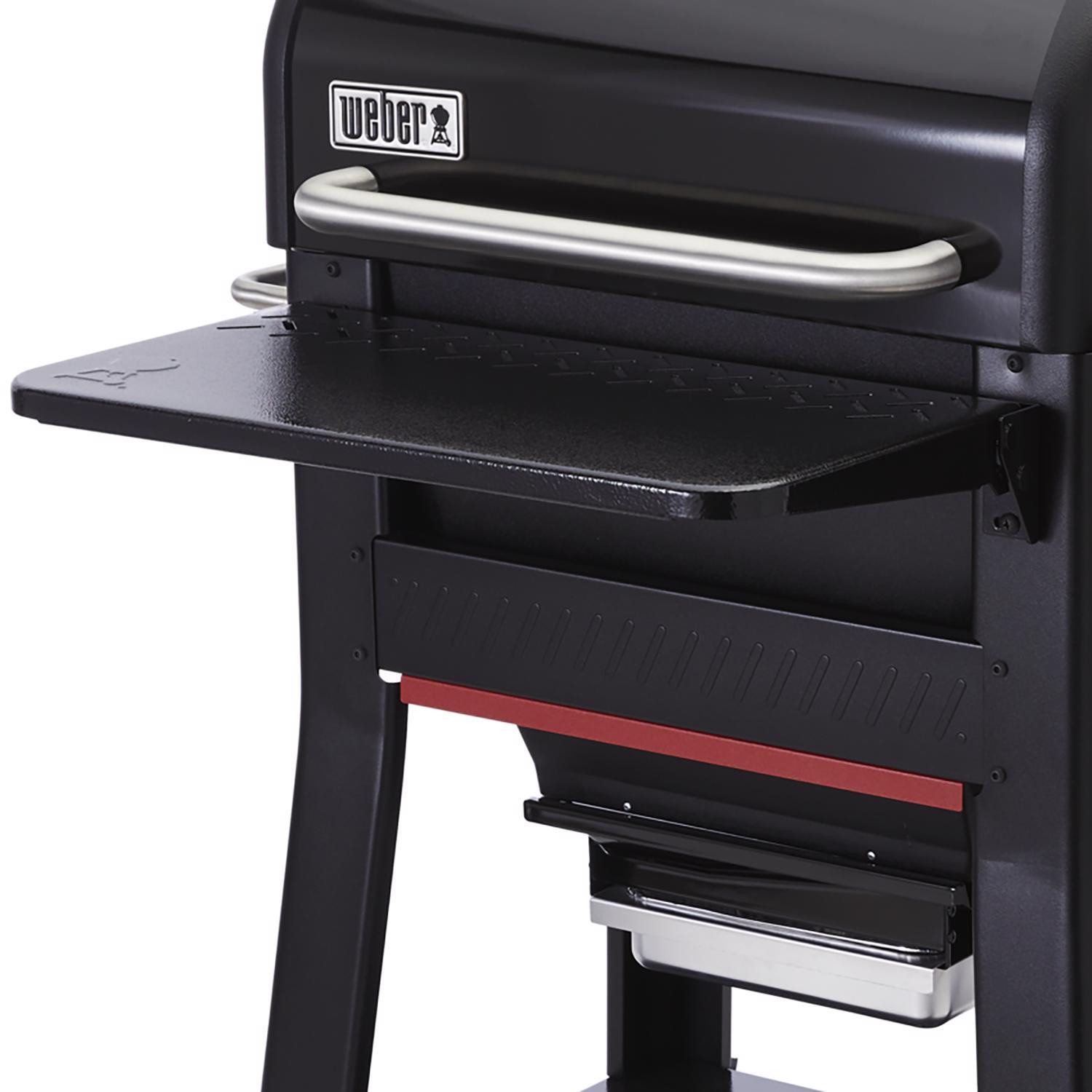 The steel front table adds over 280 square inches of extra work space. It accommodates up to 30 lbs. of food and BBQ necessities including tools, platters, and cutting boards. Then, during those times it’s not in use, it conveniently folds down. Fits searwood 600 wood pellet grill Easily attaches to the front Fold down when not in use Locks into place to add prep space